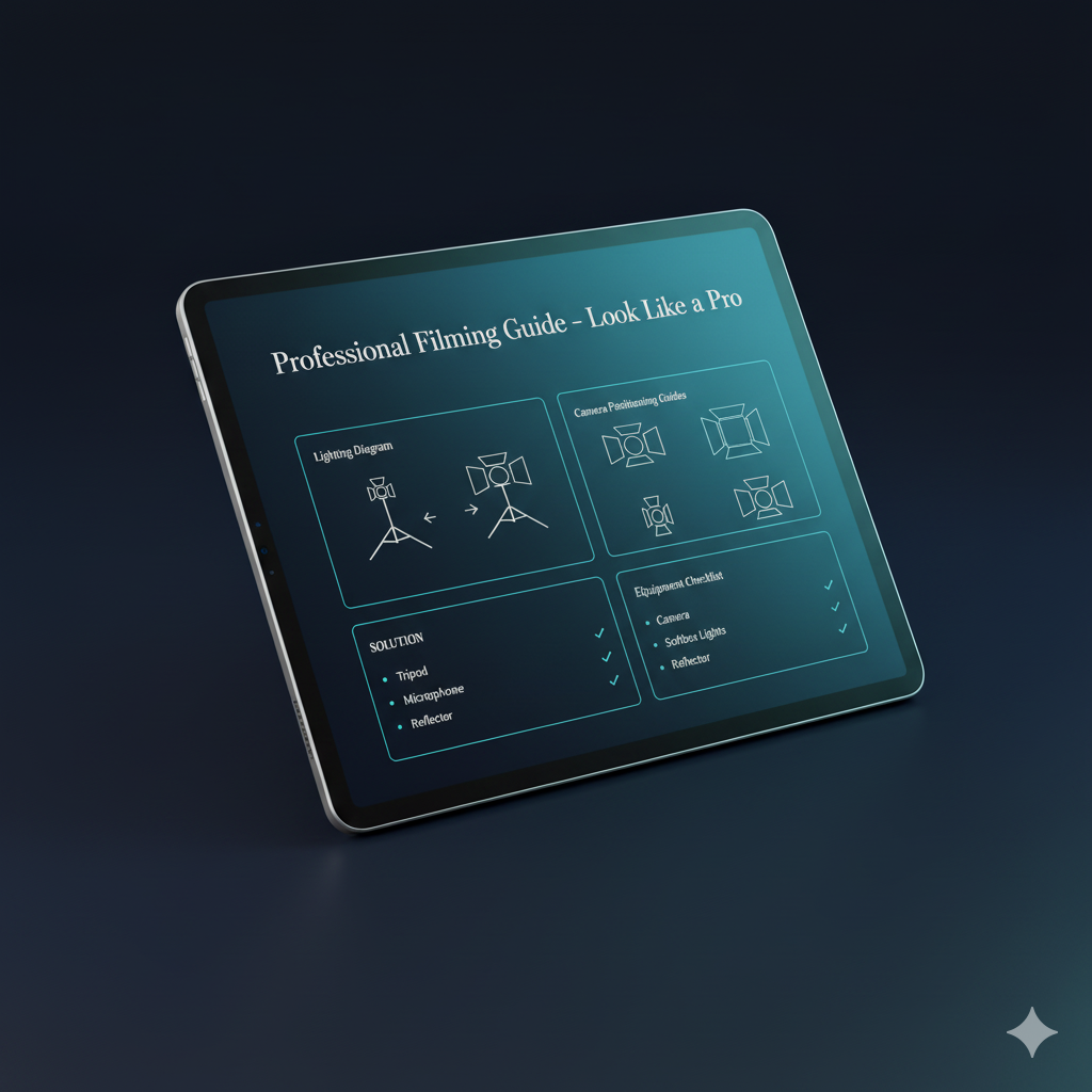 Never been on camera? No problem. We include our complete filming guide covering lighting, audio, camera positioning, and delivery techniques. The same checklist we give clients who invest $5K+ for full production.